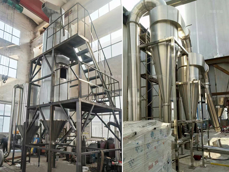 本機組是一種可以同時完成干燥和造粒的裝置。按工藝要求可以調節料液泵的壓力、流量、噴孔的大小,